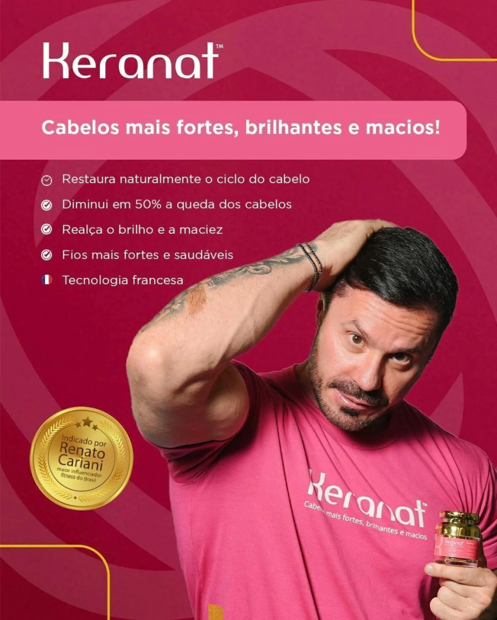 Keranat é um suplemento oral patenteado revolucionário, altamente eficaz, que fornece os nutrientes necessários para os cabelos, agindo diretamente no centro de crescimento dos fios (bulbo capilar), no interior da raiz, favorecendo a diminuição da queda, protege o pigmento natural do cabelo (previne fios brancos), aumenta o volume, previne a caspa, melhora o brilho e maciez dos cabelos de dentro para fora.